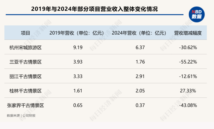 据悉,2019年,杭州、三亚及丽江三个项目在2019年营收共计超过16亿元;与之形成强烈对比的是,2024年,杭州、三亚、丽江、九寨、桂林、张家界、西安、上海、广东九大项目营收共计约19亿元。